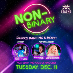 This night is our only night where Stache is open to anyone 18+ (we’re usually 21+). Enjoy delicious selections of Panther Coffee or handcrafted cocktails from Damn Good Hospitality’s expert mixologists. Join us for this FREE collaboration with DJ Hottpants, hosted by the Haus of Ungodly with performances by King Femme and Kat Wilderness! Oh, and the coat check is on us.